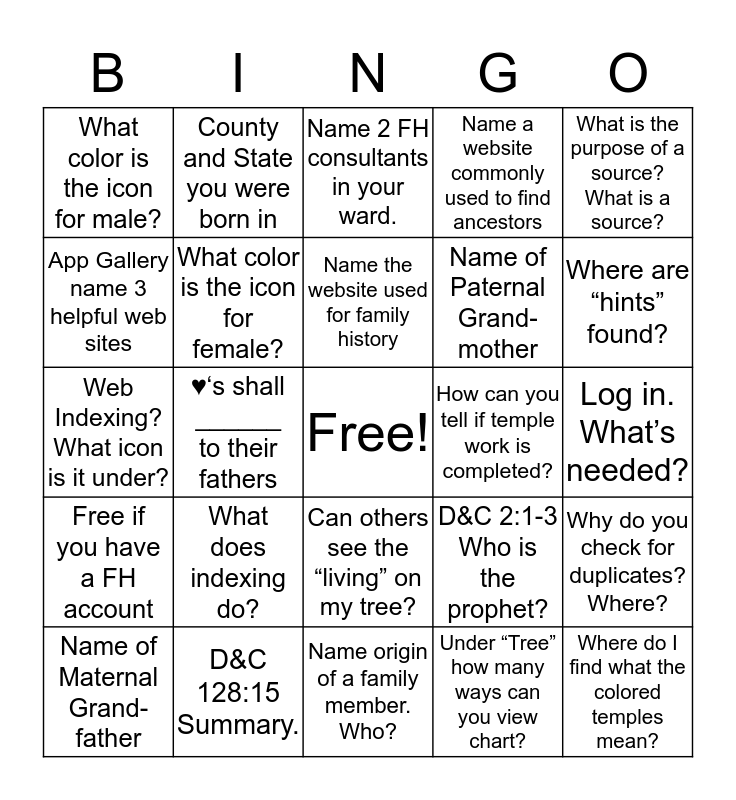 This bingo card has a free space and 24 words: Name of Maternal Grand-father, What does indexing do?, Name the website used for family history, Under “Tree” how many ways can you view chart?, What is the purpose of a source? What is a source?, What color is the icon for male?, County and State you were born in, Name 2 FH consultants in your ward., How can you tell if temple work is completed?, Log in. What’s needed?, Web Indexing? What icon is it under?, What color is the icon for female?, D&C 2:1-3 Who is the prophet?, Why do you check for duplicates? Where?, App Gallery name 3 helpful web sites, D&C 128:15 Summary., Name origin of a family member. Who?, Name a website commonly used to find ancestors, Where are “hints” found?, Free if you have a FH account, ♥️‘s shall ______ to their fathers, Can others see the “living” on my tree?, Name of Paternal Grand-mother and Where do I find what the colored temples mean?.