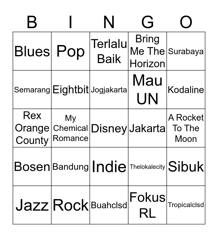This bingo card has a free space and 24 words: Bandung, Rock, Jogjakarta, Jazz, Surabaya, Blues, Semarang, Pop, Jakarta, Indie, Mau UN, Rex Orange County, Thelokalecity, Sibuk, Eightbit, Fokus RL, A Rocket To The Moon, Terlalu Baik, Kodaline, My Chemical Romance, Tropicalclsd, Bosen, Bring Me The Horizon and Buahclsd.