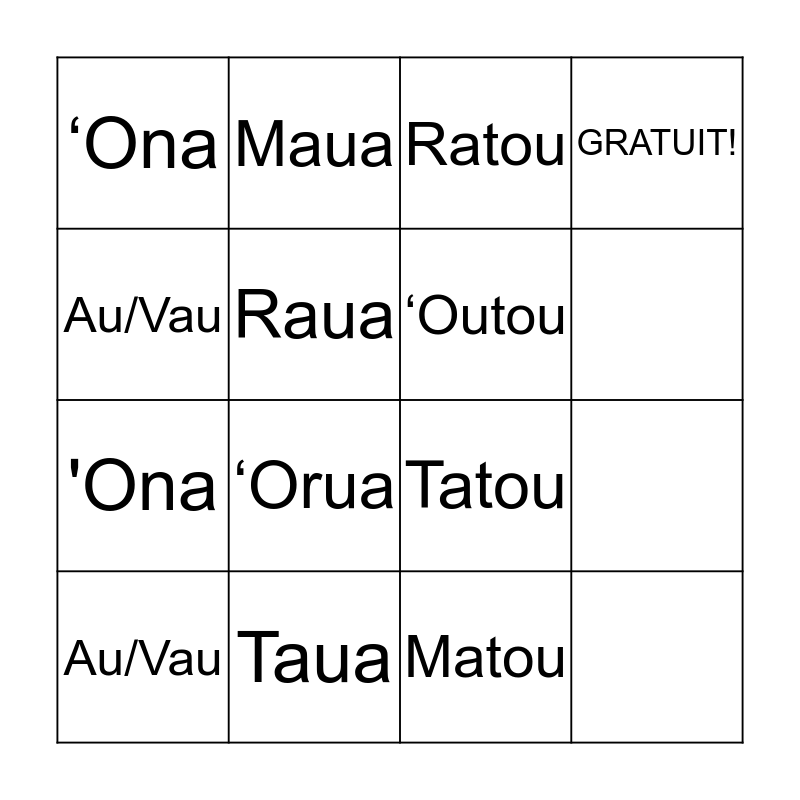 This bingo card has 16 words: ‘Oe, ‘Orua, ‘Outou, ‘Ona, Raua, Ratou, Au/Vau, Maua, Matou, Au/Vau, Taua, Tatou, 'Ona, Maua, O vai and GRATUIT!.
