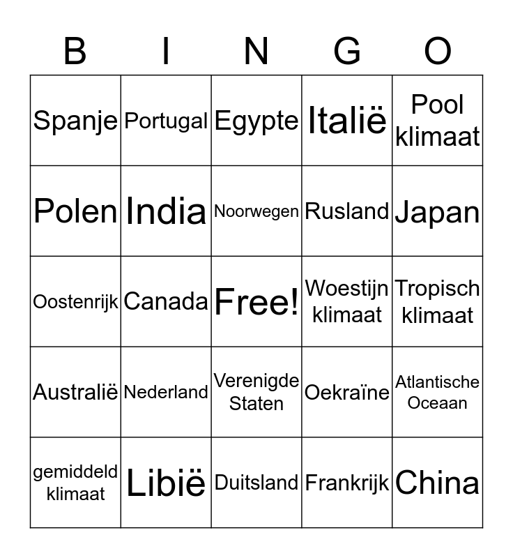 This bingo card has a free space and 24 words: Nederland, Libië, Noorwegen, gemiddeld klimaat, Pool klimaat, Spanje, Polen, Portugal, Woestijn klimaat, Verenigde Staten, Rusland, Oostenrijk, Oekraïne, Atlantische Oceaan, India, Frankrijk, Tropisch klimaat, Egypte, Japan, Canada, China, Australië, Italië and Duitsland.