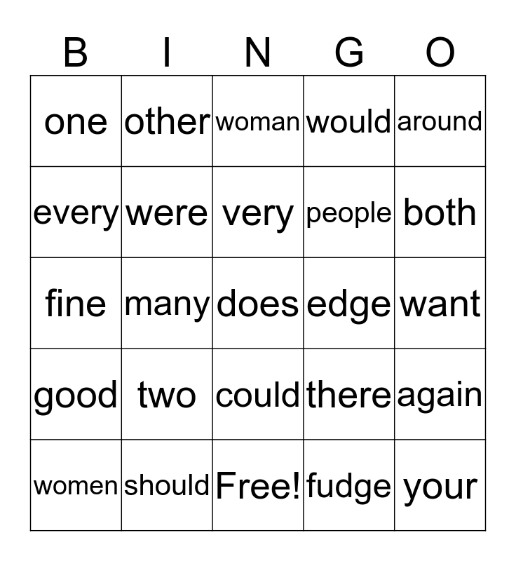 This bingo card has 25 words: good, should, does, fudge, around, one, other, woman, edge, again, every, were, Free!, there, both, women, many, very, people, want, fine, two, could, would and your.