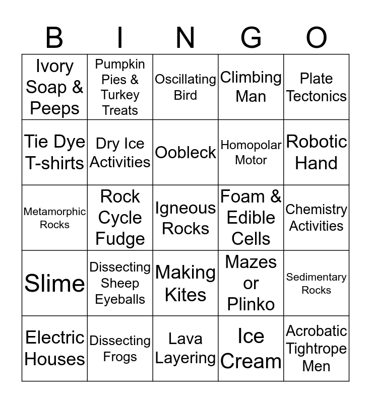 This bingo card has 27 words: Mazes or Plinko, Acrobatic Tightrope Men, Homopolar Motor, Lava Layering, Tie Dye T-shirts, Oscillating Bird, Pumpkin Pies & Turkey Treats, Slime, Foam & Edible Cells, Sedimentary Rocks, Metamorphic Rocks, Climbing Man, Electric Houses, Dissecting Frogs, Robotic Hand, Owl Pellets, Dry Ice Activities, Oobleck, Dissecting Sheep Eyeballs, Ivory Soap & Peeps, Chemistry Activities, Ice Cream, Rock Cycle Fudge, Igneous Rocks, Making Kites, Plate Tectonics and Breaking Geodes.