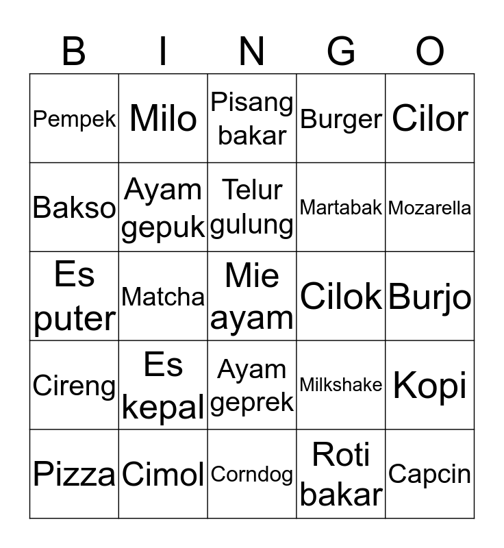 This bingo card has a free space and 24 words: Es kepal, Cimol, Telur gulung, Pizza, Cilor, Pempek, Bakso, Milo, Cilok, Ayam geprek, Martabak, Es puter, Milkshake, Kopi, Ayam gepuk, Roti bakar, Burjo, Pisang bakar, Mozarella, Matcha, Capcin, Cireng, Burger and Corndog.