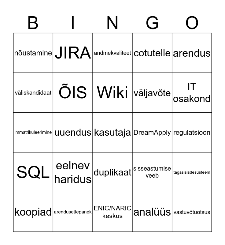 This bingo card has 45 words: juhend, kasutaja, koolitus, koopiad, korraldus, analüüs, andmekvaliteet, andmete ülekanne, arendus, arendusettepanek, cotutelle, DreamApply, duplikaat, eelnev haridus, EHIS, ENIC/NARIC keskus, haridusdokumendid, immatrikuleerimine, ingliskeelsed väljavõtted, IT osakond, JIRA, kvalifikatsioonide vastavus, lõpudokumendid, nõustamine, päring, regulatsioon, SAIS, sisehindamine, sisseastumise veeb, SQL, tagasiside, tagasisisdesüsteem, testimine, toimik, tõend, uuendus, vastuvõtueeskiri, vastuvõtukiri, vastuvõtuotsus, Wiki, väliskandidaat, väljavõte, õigused, ÕIS and õppekorraldus.