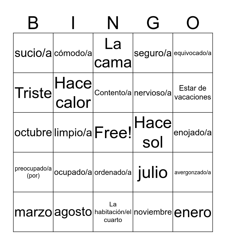 This bingo card has a free space and 66 words: abierto/a, aburrido/a, Alegre, avergonzado/a, cansado/a, cerrado/a, cómodo/a, confundido/a, Contento/a, desordenado/a, ordenado/a, enamorado/a (de), enojado/a, equivocado/a, Feliz, Triste, limpio/a, sucio/a, listo/a, nervioso/a, ocupado/a, preocupado/a (por), seguro/a, El año, La fecha, El día, El fin de semana, Afuera, enero, febrero, marzo, abril, mayo, junio, julio, agosto, septiembre, octubre, noviembre, diciembre, Hace calor, Hace frío, Hace sol, Hace viento, Hace fresco, Hacer un viaje, Estar de vacaciones, El aeropuerto, El boleto (de avión), El avión, El vuelo, El equipaje, hacer las maletas/Empacar, La llegada, La salida, el huésped, Apellido, Número de Teléfono, La cama, La habitación/el cuarto, Disponible/no disponible, La llave, El ascensor, La playa, Pescar and El mar.