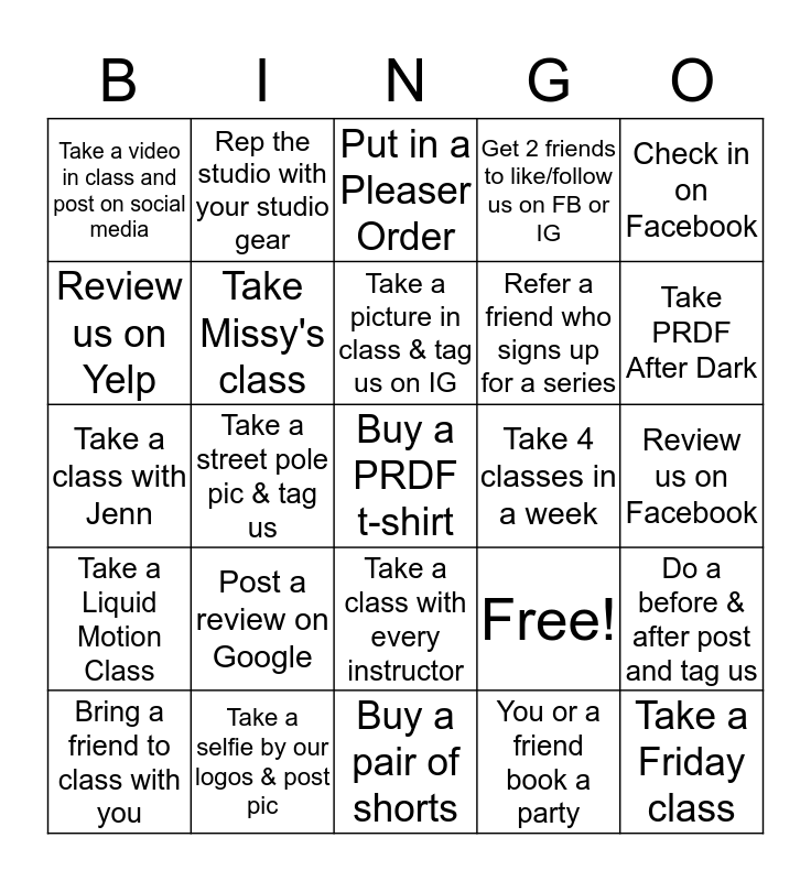 This bingo card has 25 words: Post a review on Google, Buy a pair of shorts, Take a picture in class & tag us on IG, Bring a friend to class with you, Check in on Facebook, Take a video in class and post on social media, Review us on Yelp, Rep the studio with your studio gear, Take 4 classes in a week, Take a class with every instructor, Refer a friend who signs up for a series, Take a class with Jenn, Free!, Do a before & after post and tag us, Take Missy's class, Take a Friday class, Review us on Facebook, Put in a Pleaser Order, Take PRDF After Dark, Take a street pole pic & tag us, Buy a PRDF t-shirt, Take a selfie by our logos & post pic, Take a Liquid Motion Class, Get 2 friends to like/follow us on FB or IG and You or a friend book a party.