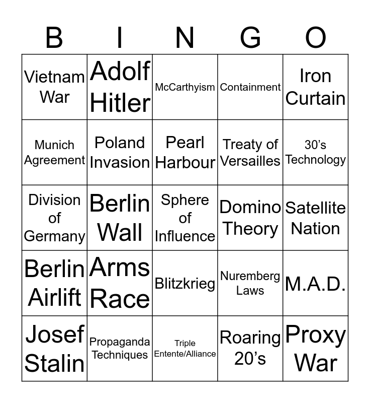 This bingo card has 41 words: Free!, Division of Germany, Appeasement, Poland Invasion, Propaganda Techniques, Blitzkrieg, Pearl Harbour, Communism, Iron Curtain, Berlin Airlift, Berlin Wall, Containment, Sphere of Influence, Satellite Nation, Domino Theory, Arms Race, Korean War, Vietnam War, Marshall Plan, McCarthyism, M.A.D., Proxy War, Triple Entente/Alliance, Treaty of Versailles, League of Nations, Inflation, Roaring 20’s, Great Depression, 30’s Technology, Penicillin Discovery, Benito Mussolini, Adolf Hitler, Josef Stalin, National Socialists, Nuremberg Laws, Munich Agreement, Japanese Internment, Holocaust, Ideology, Ideological Rainbow and Nuclear Weapons.