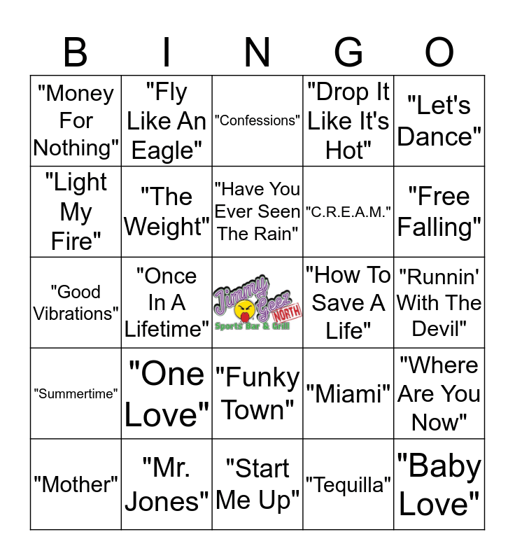 This bingo card has a free space and 24 words: "One Love", "Mr. Jones", "Have You Ever Seen The Rain", "Mother", "Let's Dance", "Money For Nothing", "Light My Fire", "Fly Like An Eagle", "How To Save A Life", "Funky Town", "C.R.E.A.M.", "Good Vibrations", "Miami", "Where Are You Now", "The Weight", "Tequilla", "Runnin' With The Devil", "Confessions", "Free Falling", "Once In A Lifetime", "Baby Love", "Summertime", "Drop It Like It's Hot" and "Start Me Up".