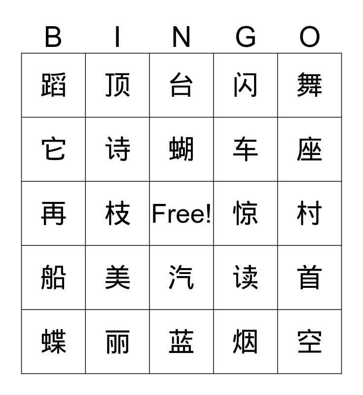 This bingo card has a free space and 24 words: 美, 丽, 蝴, 蝶, 舞, 蹈, 它, 顶, 惊, 汽, 车, 再, 读, 首, 诗, 烟, 村, 台, 座, 枝, 空, 船, 闪 and 蓝.