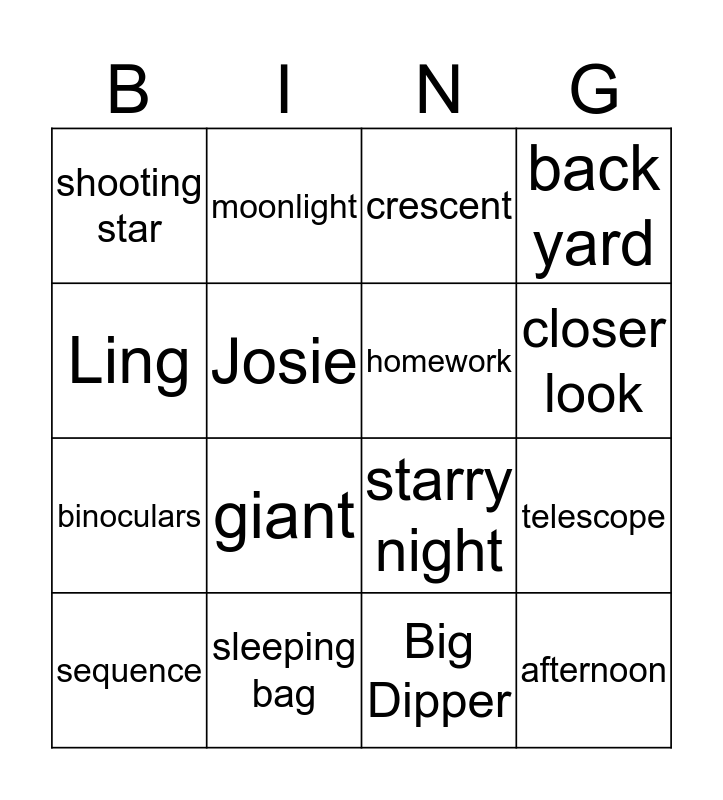 This bingo card has 16 words: sleeping bag, telescope, crescent, shooting star, binoculars, moonlight, starry night, Big Dipper, Ling, Josie, sequence, back yard, giant, closer look, homework and afternoon.