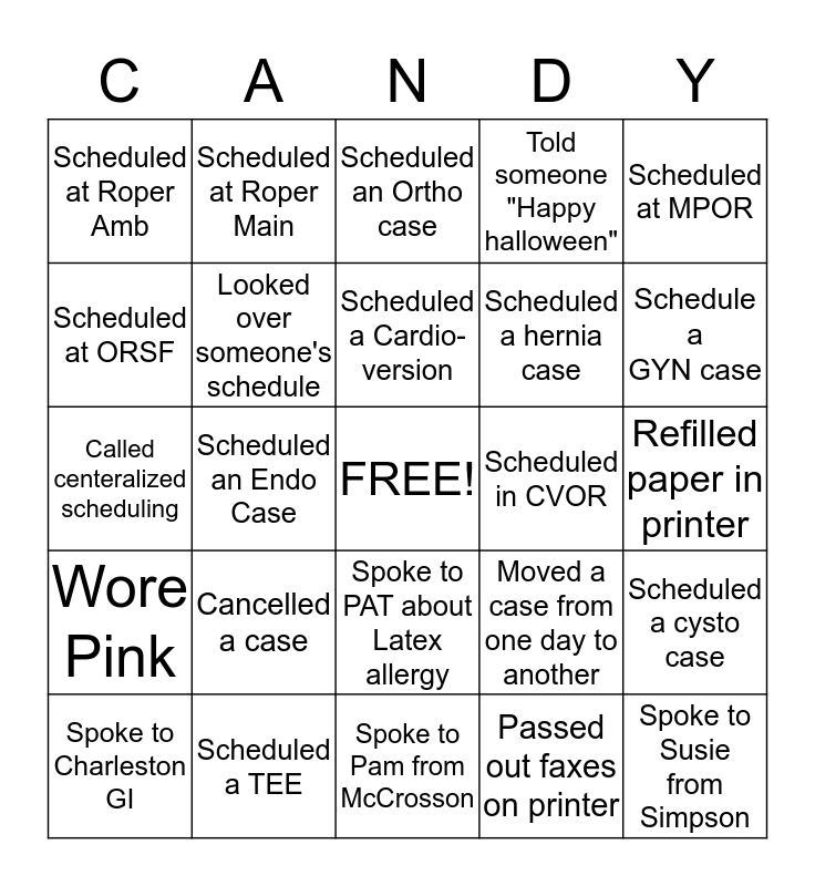 This bingo card has a free space and 24 words: Cancelled a case, Scheduled a TEE, Scheduled a Cardio-version, Spoke to Charleston GI, Scheduled at MPOR, Scheduled at Roper Amb, Scheduled at ORSF, Scheduled at Roper Main, Scheduled in CVOR, Spoke to PAT about Latex allergy, Scheduled a hernia case, Called centeralized scheduling, Moved a case from one day to another, Scheduled a cysto case, Looked over someone's schedule, Passed out faxes on printer, Refilled paper in printer, Scheduled an Ortho case, Schedule a GYN case, Scheduled an Endo Case, Spoke to Susie from Simpson, Wore Pink, Told someone "Happy halloween" and Spoke to Pam from McCrosson.