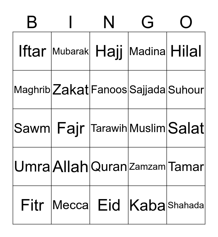 This bingo card has 25 words: Allah, Eid, Fanoos, Fitr, Hilal, Iftar, Maghrib, Mubarak, Muslim, Quran, Sajjada, Sawm, Zamzam, Tamar, Zakat, Shahada, Salat, Hajj, Suhour, Fajr, Tarawih, Mecca, Umra, Madina and Kaba.