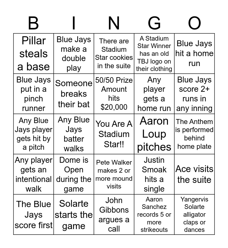 This bingo card has a free space and 24 words: Dome is Open during the game, Solarte starts the game, 50/50 Prize Amount hits $20,000, The Blue Jays score first, Blue Jays hit a home run, Pillar steals a base, Blue Jays put in a pinch runner, Blue Jays make a double play, Aaron Loup pitches, Pete Walker makes 2 or more mound visits, Any player gets a home run, Any Blue Jays player gets hit by a pitch, Justin Smoak hits a single, Ace visits the suite, Someone breaks their bat, Aaron Sanchez records 5 or more strikeouts, The Anthem is performed behind home plate, There are Stadium Star cookies in the suite, Blue Jays score 2+ runs in any inning, Any Blue Jays batter walks, Yangervis Solarte alligator claps or dances, Any player gets an intentional walk, A Stadium Star Winner has an old TBJ logo on their clothing and John Gibbons argues a call.