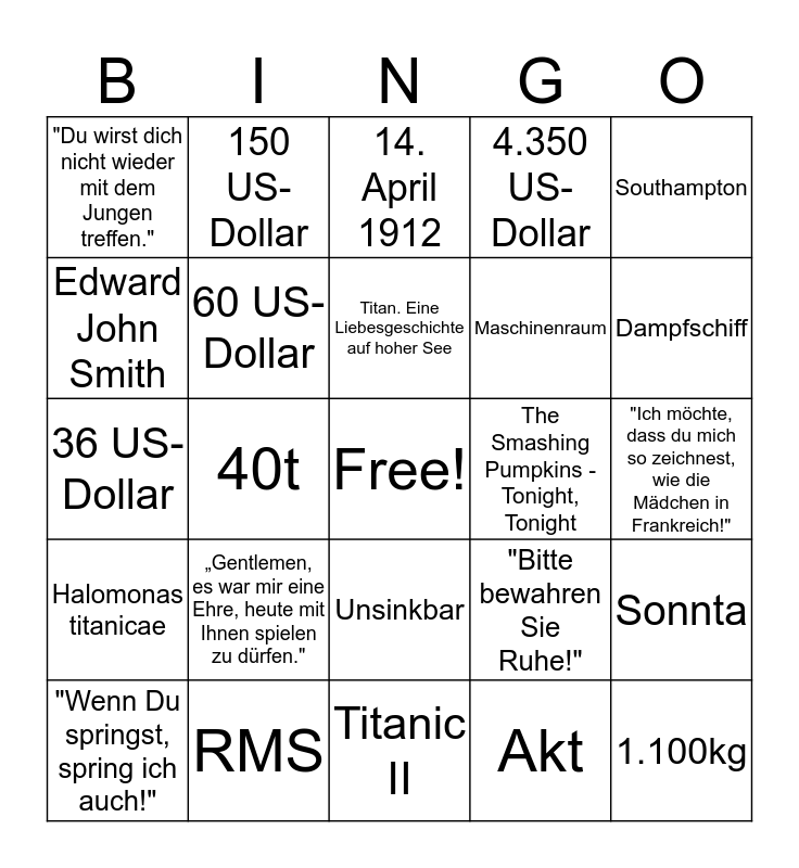 This bingo card has a free space and 75 words: RMS Titanic, White Star Line, 14. April 1912, 23:40 Uhr, Eisberg, zwei Stunden und 40 Minuten, 20, Untergang, 269m, 52.310t, Leonardo DiCaprio, Kate Winslet, Titan. Eine Liebesgeschichte auf hoher See, Edward John Smith, 72,5t, 40t, 400kg, 1.100kg, 897, Southampton, New York, 36 US-Dollar, 60 US-Dollar, 150 US-Dollar, 4.350 US-Dollar, Das größte Schiff der Welt, 1.514, 1.300, Similde, 1997, 15, elf, 2.224, "Bitte bewahren Sie Ruhe!", Dampfschiff, Maschinenraum, Tränen, Das Herz des Ozeans, "Ich möchte, dass du mich so zeichnest, wie die Mädchen in Frankreich!", Akt, Jungfernfahrt, Klassengesellschaft, Sie spielten bis zum Schluss., "Ich fliege.", "Ich konnte nicht gehen.", "Es ist eine mathematische Gewissheit.", "Wenn Du springst, spring ich auch!", "Du wirst dich nicht wieder mit dem Jungen treffen.", James Cameron, "Ich bin der König der Welt!", U-Boote, Unsinkbar, Celine Dion, My Heart Will Go On, Peter Schilling, Terra Titanic, Wasser, William M. Murdoch, Joseph Bruce Ismay, -2°C, „Gentlemen, es war mir eine Ehre, heute mit Ihnen spielen zu dürfen.", TITANIC, Martin Sonneborn, "She's even affecting my work, now. She's the Titanic.", Sarah Michelle Gellar, The Smashing Pumpkins - Tonight, Tonight, Dienstag&Donnerstag, 38.758, 300.000t, Sonnta, Halomonas titanicae, RMS, Chuck Norris, Titanic II and Titanic - Die Rückkehr.