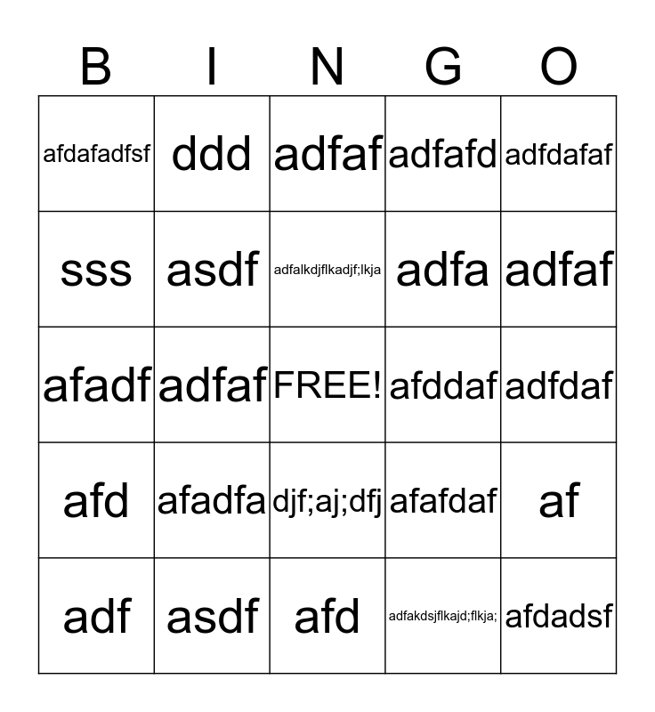 This bingo card has a free space and 26 words: djf;aj;dfj, adfakdsjflkajd;flkja;, adfalkdjflkadjf;lkja, asdf, adfdafaf, afdafadfsf, sss, ddd, adfdaf, afafdaf, adfa, afadf, af, adf, adfaf, afd, adfafd, afd, adfaf, afdadsf, adfaf, afd, afddaf, afadfa, asdf and adfdaf.