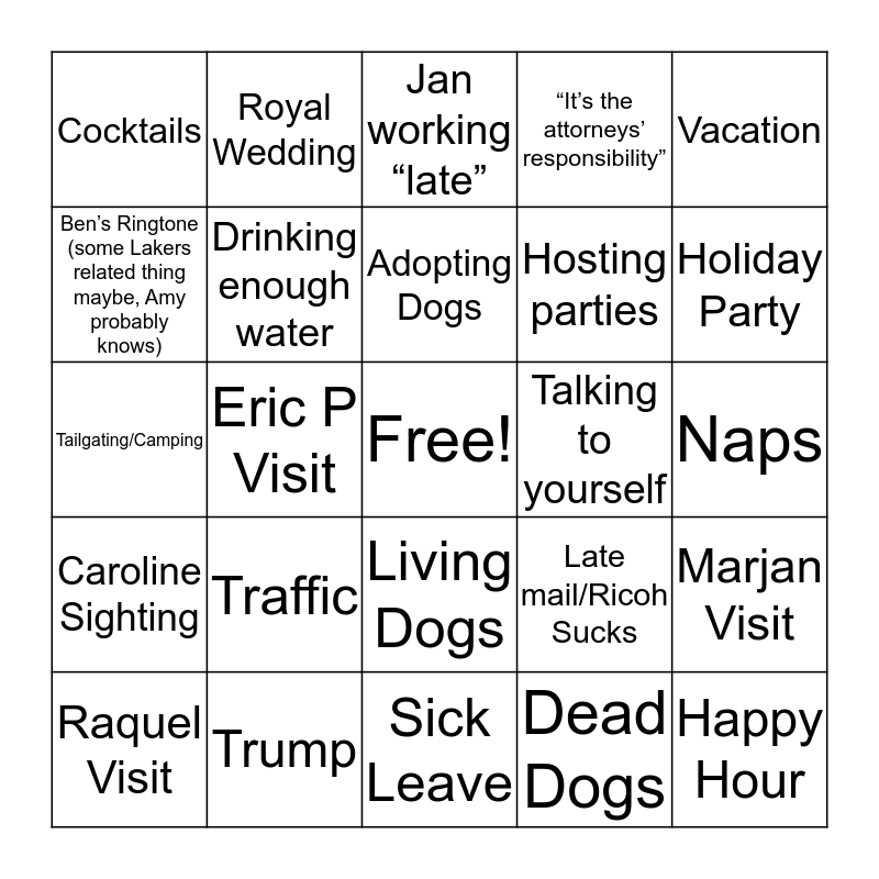 This bingo card has a free space and 26 words: Living Dogs, Dead Dogs, Adopting Dogs, Trump, Vacation, Cocktails, Ben’s Ringtone (some Lakers related thing maybe, Amy probably knows), Royal Wedding, Naps, Late mail/Ricoh Sucks, Hosting parties, Tailgating/Camping, Marjan Visit, Raquel Visit, Eric P Visit, Karleen Sucks, “It’s the attorneys’ responsibility”, Caroline Sighting, Jan working “late”, Happy Hour, Holiday Party, Sick Leave, Talking to yourself, Traffic, Drinking enough water and “Where’s Jan”.