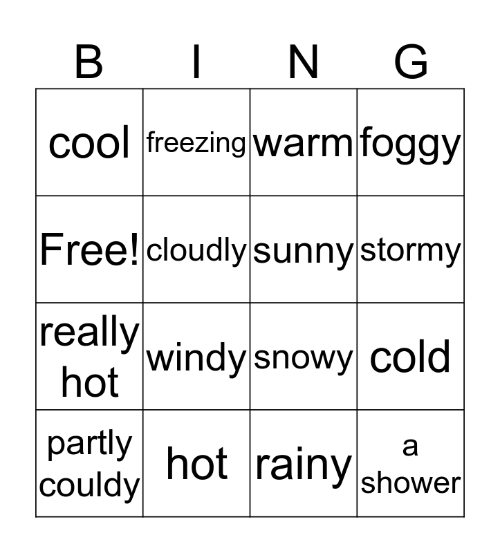 This bingo card has 16 words: hot, cold, warm, cool, really hot, freezing, snowy, rainy, Free!, cloudly, partly couldy, foggy, windy, stormy, sunny and a shower.