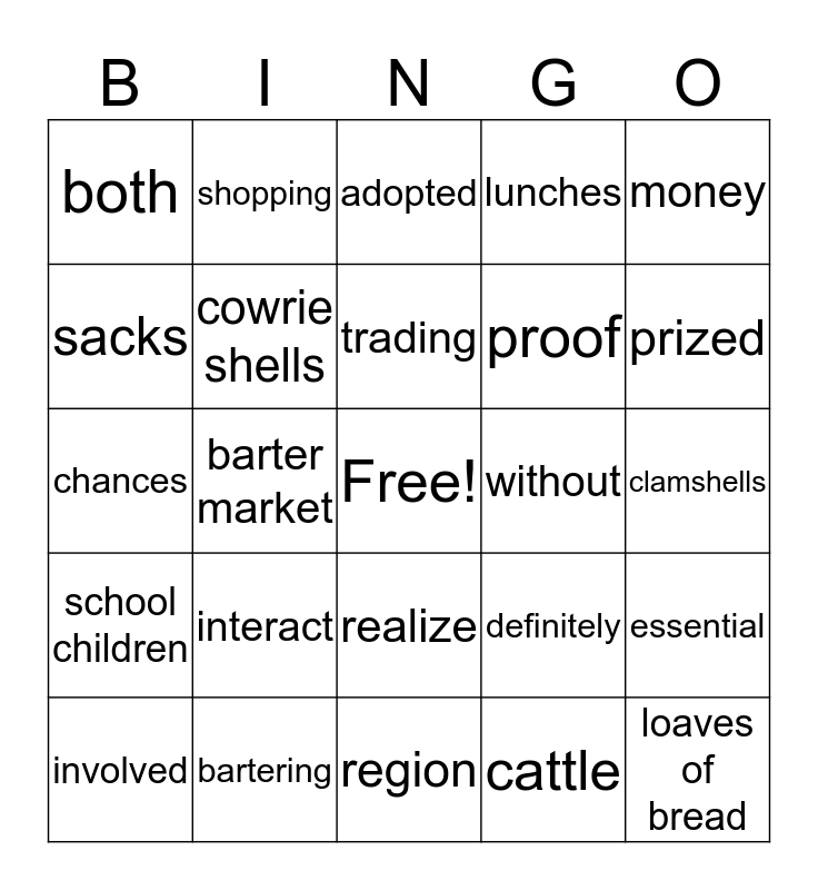 This bingo card has a free space and 24 words: interact, bartering, trading, involved, money, both, sacks, shopping, without, realize, proof, chances, definitely, essential, cowrie shells, cattle, clamshells, adopted, prized, barter market, loaves of bread, school children, lunches and region.