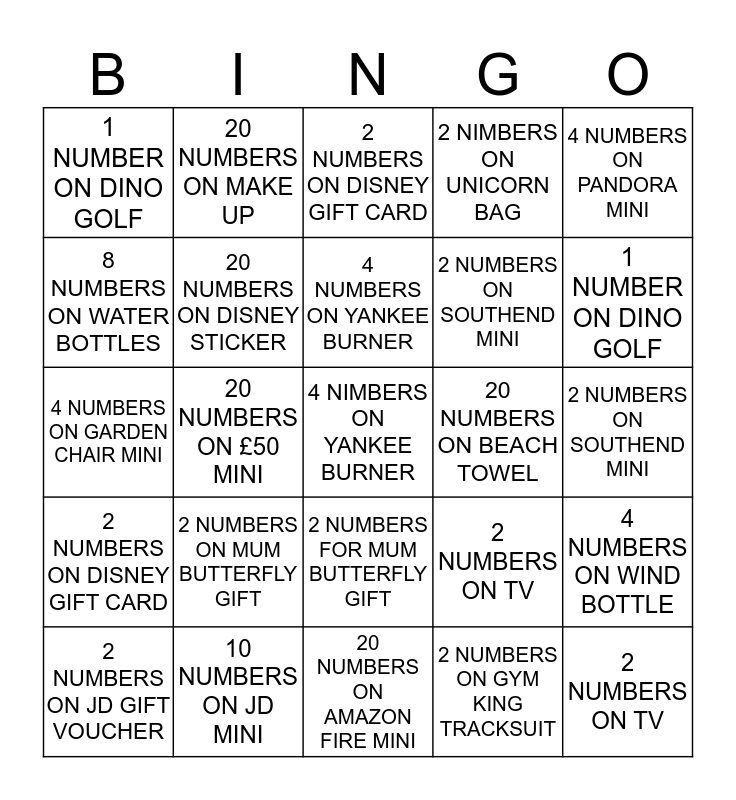 This bingo card has a free space and 24 words: 2 NUMBERS ON JD GIFT VOUCHER, 2 NUMBERS ON MUM BUTTERFLY GIFT, 4 NUMBERS ON YANKEE BURNER, 2 NUMBERS ON GYM KING TRACKSUIT, 4 NUMBERS ON PANDORA MINI, 1 NUMBER ON DINO GOLF, 20 NUMBERS ON MAKE UP, 2 NUMBERS ON DISNEY GIFT CARD, 20 NUMBERS ON BEACH TOWEL, 2 NUMBERS ON SOUTHEND MINI, 4 NUMBERS ON GARDEN CHAIR MINI, 20 NUMBERS ON DISNEY STICKER, 2 NUMBERS ON TV, 4 NUMBERS ON WIND BOTTLE, 8 NUMBERS ON WATER BOTTLES, 10 NUMBERS ON JD MINI, 20 NUMBERS ON AMAZON FIRE MINI, 2 NIMBERS ON UNICORN BAG, 1 NUMBER ON DINO GOLF, 2 NUMBERS ON DISNEY GIFT CARD, 20 NUMBERS ON £50 MINI, 2 NUMBERS FOR MUM BUTTERFLY GIFT, 2 NUMBERS ON SOUTHEND MINI and 2 NUMBERS ON TV.