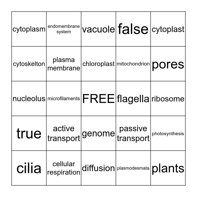 This bingo card has a free space and 24 words: active transport, cellular respiration, chloroplast, cilia, cytoplast, cytoplasm, cytoskelton, endomembrane system, flagella, genome, mitochondrion, nucleolus, passive transport, photosynthesis, plasma membrane, plasmodesmata, ribosome, vacuole, pores, microfilaments, plants, true, false and diffusion.