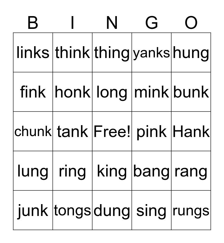 This bingo card has a free space and 32 words: sing, rink, tank, song, lung, honk, hung, rang, think, fang, long, thing, gong, wink, pink, zing, junk, chunk, king, ring, bang, dunk, Hank, tongs, rungs, yanks, mink, fink, links, dung, sink and bunk.