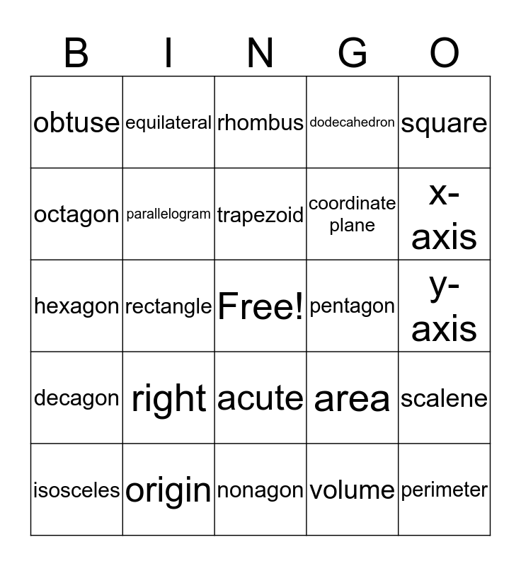 This bingo card has a free space and 24 words: right, origin, trapezoid, isosceles, square, obtuse, octagon, equilateral, pentagon, acute, coordinate plane, hexagon, area, scalene, parallelogram, volume, y-axis, rhombus, x-axis, rectangle, perimeter, decagon, dodecahedron and nonagon.