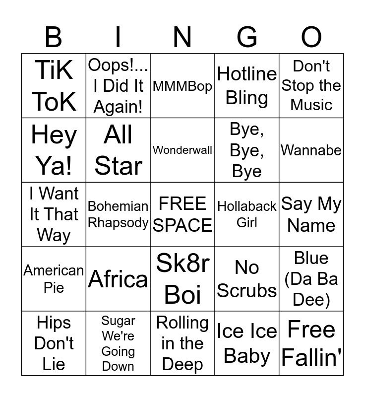 This bingo card has a free space and 24 words: Africa, Sugar We're Going Down, Wonderwall, Hips Don't Lie, Don't Stop the Music, TiK ToK, Hey Ya!, Oops!... I Did It Again!, Hollaback Girl, Sk8r Boi, Bye, Bye, Bye, I Want It That Way, No Scrubs, Blue (Da Ba Dee), All Star, Ice Ice Baby, Say My Name, MMMBop, Wannabe, Bohemian Rhapsody, Free Fallin', American Pie, Hotline Bling and Rolling in the Deep.