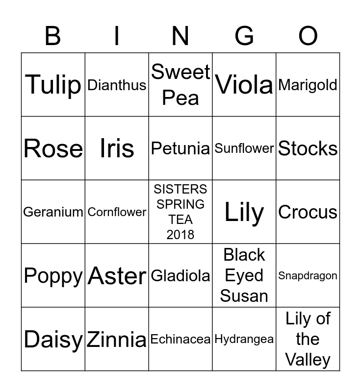 This bingo card has a free space and 24 words: Aster, Zinnia, Petunia, Daisy, Marigold, Tulip, Rose, Dianthus, Lily, Gladiola, Sunflower, Geranium, Black Eyed Susan, Snapdragon, Iris, Hydrangea, Crocus, Sweet Pea, Stocks, Cornflower, Lily of the Valley, Poppy, Viola and Echinacea.