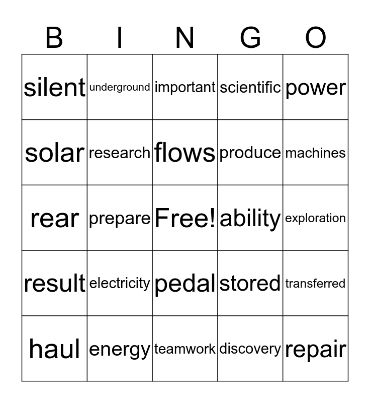 This bingo card has a free space and 24 words: electricity, energy, flows, haul, power, silent, solar, underground, ability, pedal, produce, rear, stored, transferred, research, discovery, exploration, important, machines, prepare, repair, result, scientific and teamwork.