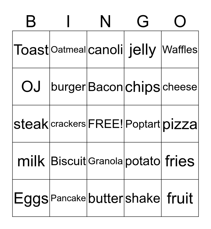 This bingo card has a free space and 24 words: Biscuit, Pancake, Bacon, Eggs, Waffles, Toast, OJ, Oatmeal, Poptart, Granola, chips, steak, potato, fries, burger, shake, pizza, canoli, cheese, crackers, fruit, milk, jelly and butter.
