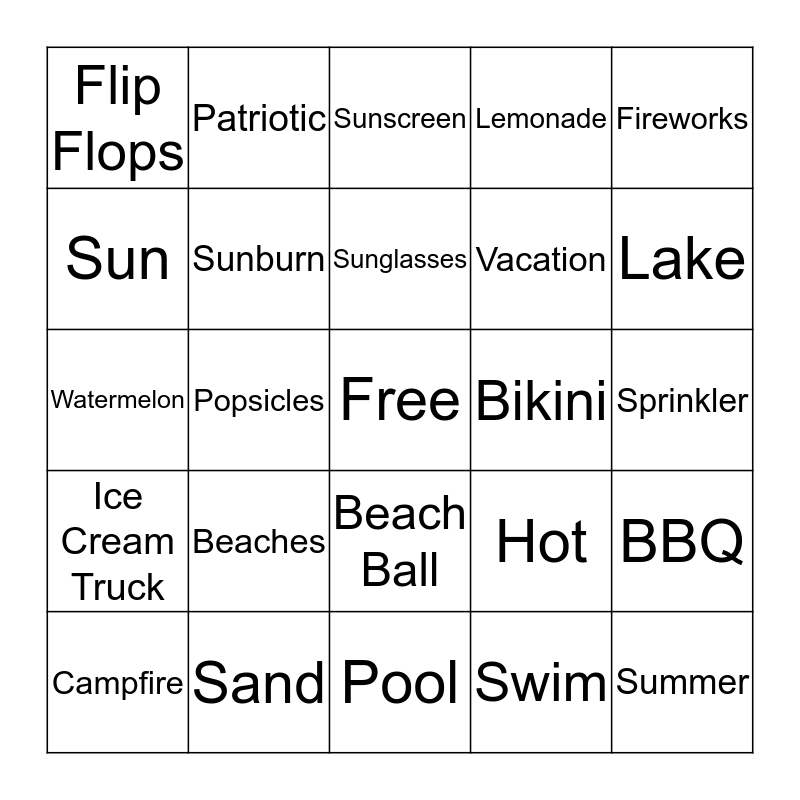 This bingo card has a free space and 24 words: Beaches, Sand, Sunglasses, Campfire, Fireworks, Flip Flops, Sun, Patriotic, Bikini, Beach Ball, Vacation, Watermelon, Hot, BBQ, Sunburn, Swim, Sprinkler, Sunscreen, Lake, Popsicles, Summer, Ice Cream Truck, Lemonade and Pool.