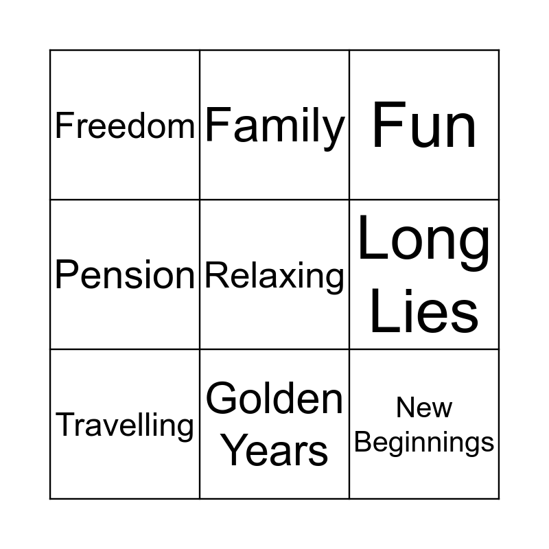 This bingo card has 9 words: Travelling, Fun, Family, Pension, Freedom, Long Lies, Relaxing, New Beginnings and Golden Years.