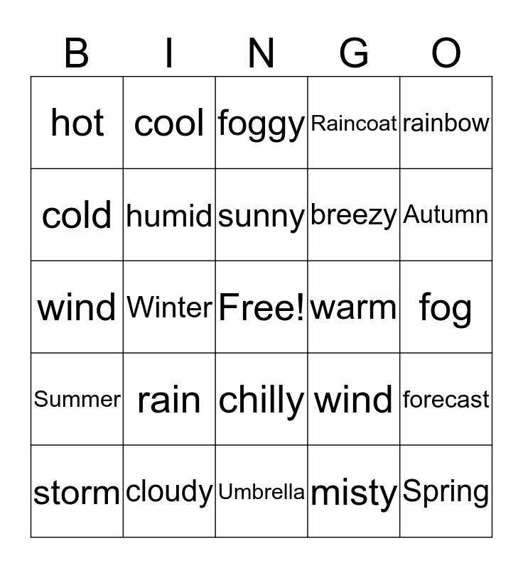 This bingo card has a free space and 24 words: rain, cloudy, sunny, storm, rainbow, hot, cold, cool, warm, chilly, breezy, wind, wind, forecast, humid, misty, fog, foggy, Autumn, Winter, Spring, Summer, Raincoat and Umbrella.