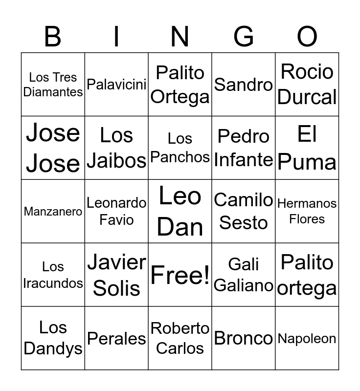 This bingo card has 27 words: Free!, Los Dandys, Los Jaibos, Vicente, Pedro Infante, Rocio Durcal, Los Tres Diamantes, Javier Solis, Los Panchos, Bronco, Hermanos Flores, Jose Jose, Perales, Roberto Carlos, Camilo Sesto, Napoleon, Manzanero, Palavicini, Leo Dan, Sandro, Palito ortega, Los Iracundos, Leonardo Favio, Palito Ortega, Gali Galiano, El Puma and Piero.