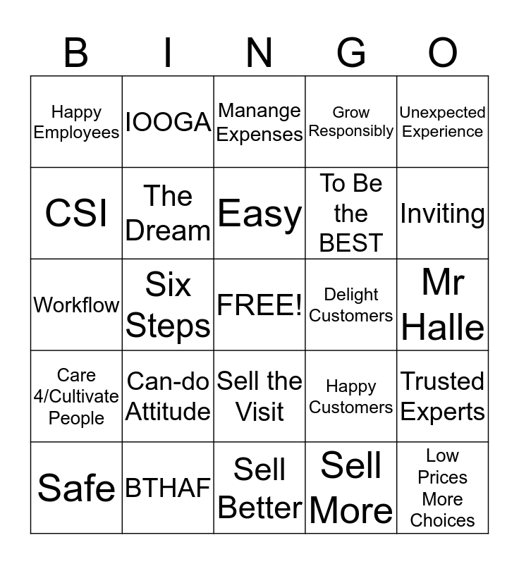 This bingo card has a free space and 24 words: Can-do Attitude, BTHAF, Easy, Safe, Unexpected Experience, Happy Employees, CSI, IOOGA, Delight Customers, Sell the Visit, To Be the BEST, Workflow, Happy Customers, Trusted Experts, The Dream, Sell More, Mr Halle, Manange Expenses, Inviting, Six Steps, Low Prices More Choices, Care 4/Cultivate People, Grow Responsibly and Sell Better.