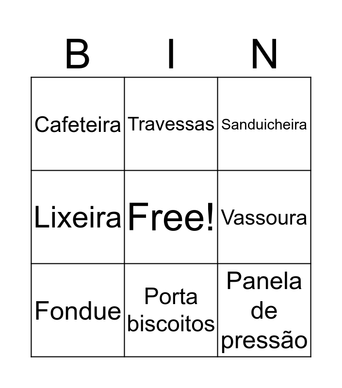 This bingo card has a free space and 30 words: Batedeira, Liquidificador, Espremedor de laranja, Mixer, Cafeteira, Sanduicheira, Fondue, Pratos, Copos, Xícaras, Faqueiro, Facas, Concha, Espremedor de batata, Espremedor de alho, Rolo de macarrão, Tábua de corte, Porta condimentos, Panelas (ou caçarolas), Panela de pressão, Assadeira, Forma de bolo, Travessas, Colher de pau, Vassoura, Lixeira, Pano de prato, Pá, Porta biscoitos and Jogo americano.