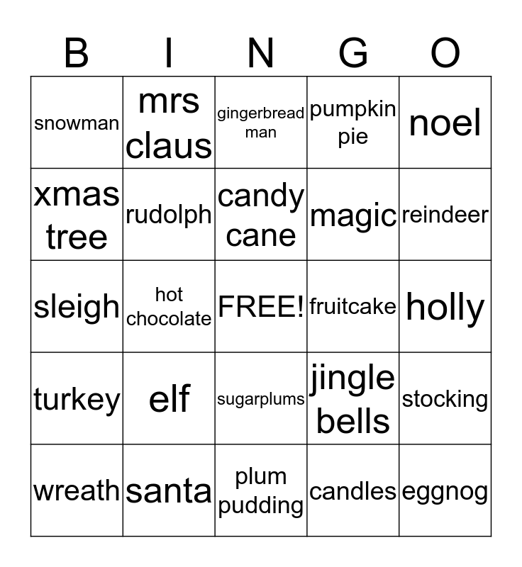 This bingo card has a free space and 24 words: elf, santa, candy cane, wreath, noel, snowman, xmas tree, mrs claus, fruitcake, sugarplums, magic, sleigh, jingle bells, stocking, rudolph, candles, holly, gingerbread man, reindeer, hot chocolate, eggnog, turkey, pumpkin pie and plum pudding.