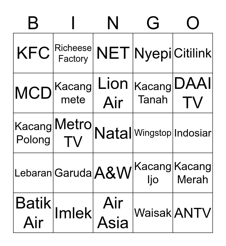 This bingo card has 25 words: Garuda, Air Asia, Lion Air, Batik Air, Citilink, KFC, MCD, Richeese Factory, Wingstop, A&W, Kacang Tanah, Kacang Polong, Kacang Ijo, Kacang Merah, Kacang mete, ANTV, Indosiar, NET, DAAI TV, Metro TV, Natal, Imlek, Lebaran, Nyepi and Waisak.