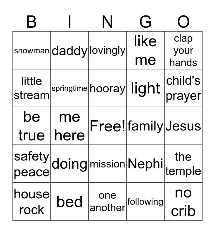 This bingo card has a free space and 24 words: doing, bed, hooray, house rock, clap your hands, snowman, little stream, daddy, family, mission, light, be true, Nephi, the temple, springtime, following, Jesus, lovingly, child's prayer, me here, no crib, safety peace, like me and one another.