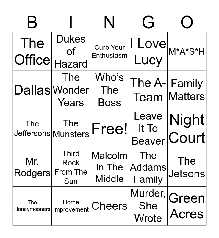 This bingo card has a free space and 27 words: The Addams Family, King Of The Hill, The A-Team, Cheers, Dallas, Curb Your Enthusiasm, Dukes of Hazard, Mr. Rodgers, Leave It To Beaver, The Jetsons, The Jeffersons, I Love Lucy, The Honeymooners, Home Improvement, Family Matters, The X Files, The Wonder Years, Who’s The Boss, Third Rock From The Sun, The Office, Night Court, Murder, She Wrote, The Munsters, Green Acres, Malcolm In The Middle, M*A*S*H and All In The Family.