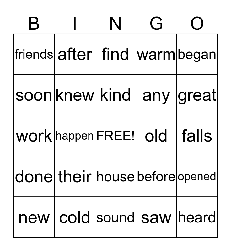 This bingo card has a free space and 28 words: opened, every, any, saw, soon, find, after, done, old, new, work, warm, cold, sound, great, know, their, knew, kind, house, friends, far, heard, happen, falls, before, began and told.