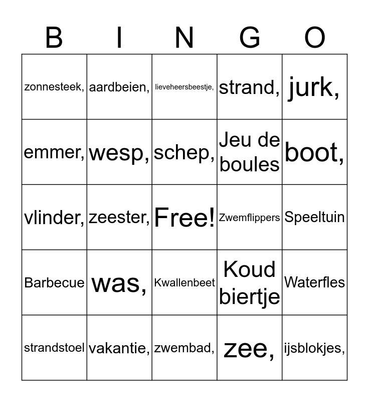 This bingo card has a free space and 74 words: gieter,, bloem,, lieveheersbeestje,, zonnebloem,, vis,, kwal, schaduw,, t-shirt,, strandstoel, zonnebrand,, zonnebril,, strandlaken,, schep,, emmer,, schelp,, zeester,, strandbal,, boot,, vlieger,, vlinder,, wesp,, aardbeien,, strand,, tent,, ijsblokjes,, ijsje,, sorbet, limonade, parasol,, korte broek,, jurk,, slippers,, sandalen,, zandkasteel,, badpak,, zee,, zon,, zwembroek, zwemmen, zand,, zwembad,, vakantie,, caravan,, hotel,, zomerhuisje, zonnesteek,, bikini,, was,, picknick,, fototoestel,, Pet, Zwemband, Speeltuin, Mug, Muggenbult, Zonnescherm, Kwallenbeet, Vouwwagen, Tentharing, Waterfles, Jeu de boules, Badminton, Barbecue, Pretpark, Zwemflippers, Meloen, Hangmat, Cocktail, Koud biertje, Limonade, Surfen, Palmboom, Koelbox and Dierentuin.