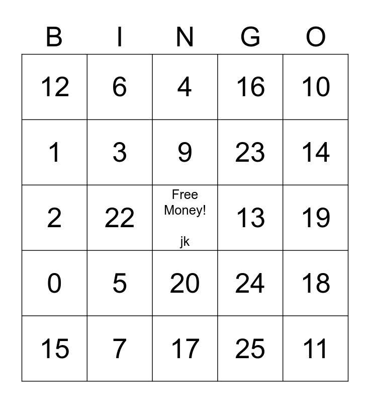 This bingo card has a free space and 24 words: 5, 7, 9, 15, 10, 12, 1, 6, 13, 20, 23, 2, 24, 18, 3, 25, 19, 4, 14, 22, 11, 0, 16 and 17.