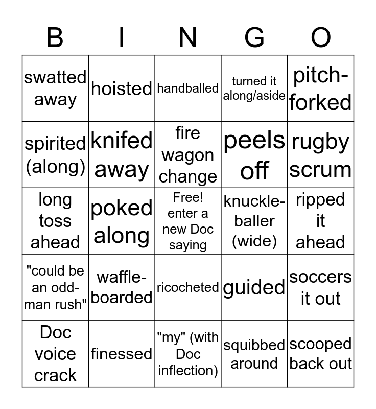 This bingo card has a free space and 24 words: waffle-boarded, finessed, fire wagon change, Doc voice crack, pitch-forked, swatted away, spirited (along), hoisted, knuckle-baller (wide), ricocheted, peels off, long toss ahead, guided, soccers it out, knifed away, squibbed around, ripped it ahead, handballed, rugby scrum, poked along, scooped back out, "could be an odd-man rush", turned it along/aside and "my" (with Doc inflection).