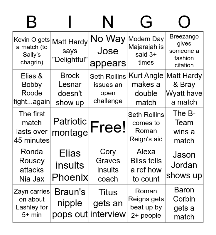 This bingo card has a free space and 24 words: Elias insults Phoenix, Braun's nipple pops out, Seth Rollins issues an open challenge, Zayn carries on about Lashley for 5+ min, Breezango gives someone a fashion citation, Kevin O gets a match (to Sally's chagrin), Elias & Bobby Roode fight...again, Matt Hardy says "Delightful", Seth Rollins comes to Roman Reign's aid, Cory Graves insults coach, Kurt Angle makes a double match, The first match lasts over 45 minutes, Alexa Bliss tells a ref how to count, Jason Jordan shows up, Brock Lesnar doesn't show up, Roman Reigns gets beat up by 2+ people, The B-Team wins a match, No Way Jose appears, Matt Hardy & Bray Wyatt have a match, Patriotic montage, Baron Corbin gets a match, Ronda Rousey attacks Nia Jax, Modern Day Majarajah is said 3+ times and Titus gets an interview.