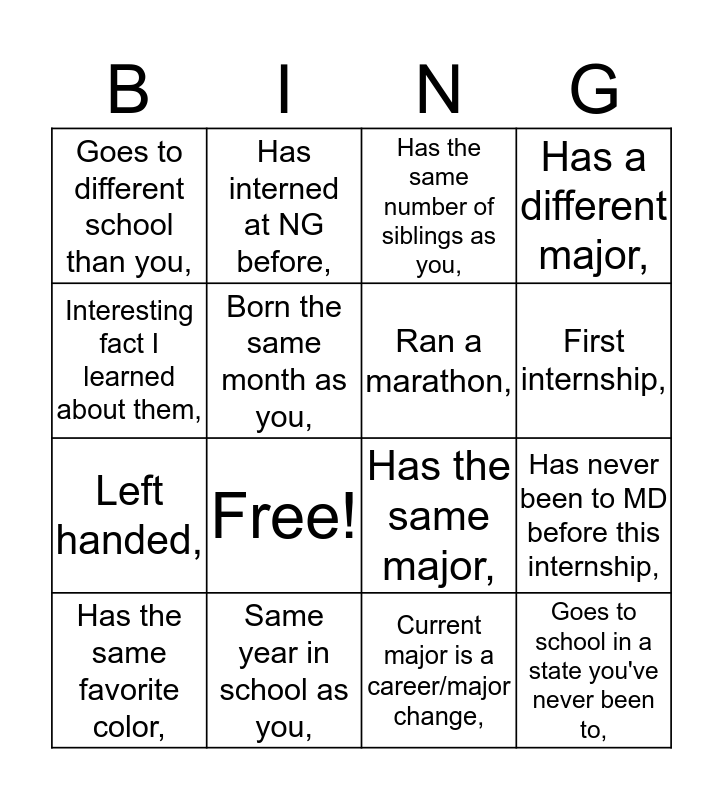 This bingo card has 18 words: Free!, Goes to school in a state you've never been to,, Has the same number of siblings as you,, Goes to different school than you,, Has the same major,, Has a different major,, Has the same favorite color,, Has interned at NG before,, First internship,, Left handed,, Current major is a career/major change,, Interesting fact I learned about them,, Has never been to MD before this internship,, Born the same month as you,, Ran a marathon,, Has a mutual hobby,, Same year in school as you, and Wearing the same color as you,.