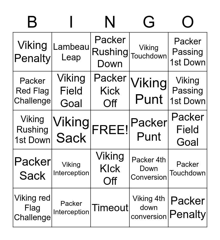 This bingo card has a free space and 24 words: Viking Interception, Packer Interception, Packer Kick Off, Viking red Flag Challenge, Packer Passing 1st Down, Viking Penalty, Packer Red Flag Challenge, Lambeau Leap, Packer Punt, Viking KIck Off, Viking Punt, Viking Rushing 1st Down, Packer 4th Down Conversion, Packer Touchdown, Viking Field Goal, Viking 4th down conversion, Packer Field Goal, Packer Rushing Down, Viking Passing 1st Down, Viking Sack, Packer Penalty, Packer Sack, Viking Touchdown and Timeout.