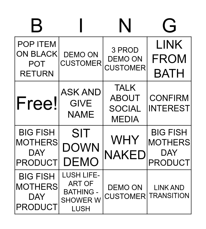 This bingo card has 16 words: LUSH LIFE- ART OF BATHING - SHOWER W LUSH, BIG FISH MOTHERS DAY PRODUCT, 3 PROD DEMO ON CUSTOMER, POP ITEM ON BLACK POT RETURN, BIG FISH MOTHERS DAY PRODUCT, DEMO ON CUSTOMER, WHY NAKED, DEMO ON CUSTOMER, Free!, ASK AND GIVE NAME, BIG FISH MOTHERS DAY PRODUCT, LINK FROM BATH, SIT DOWN DEMO, CONFIRM INTEREST, TALK ABOUT SOCIAL MEDIA and LINK AND TRANSITION.
