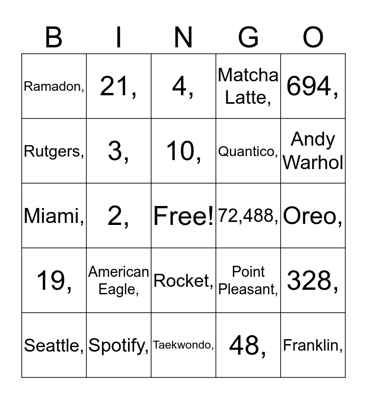 This bingo card has a free space and 32 words: 48,, 23,, 2,, 7,, 19,, 3,, 694,, 328,, 21,, 33,543,, 10,, 4,, 256,, 843,, 72,488,, Harry Potter,, Seattle,, Miami,, Rocket,, American Eagle,, Point Pleasant,, Shiba Inu,, Oreo,, Spotify,, Franklin,, Matcha Latte,, Quantico,, Rutgers,, Ramadon,, Taekwondo,, Tokyo, and Andy Warhol.