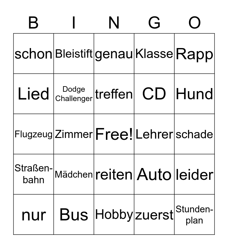 This bingo card has a free space and 24 words: Mädchen, Bus, treffen, nur, Rapp, schon, Lied, Bleistift, Lehrer, reiten, CD, Flugzeug, Auto, leider, Dodge Challenger, zuerst, schade, genau, Hund, Zimmer, Stunden- plan, Straßen- bahn, Klasse and Hobby.